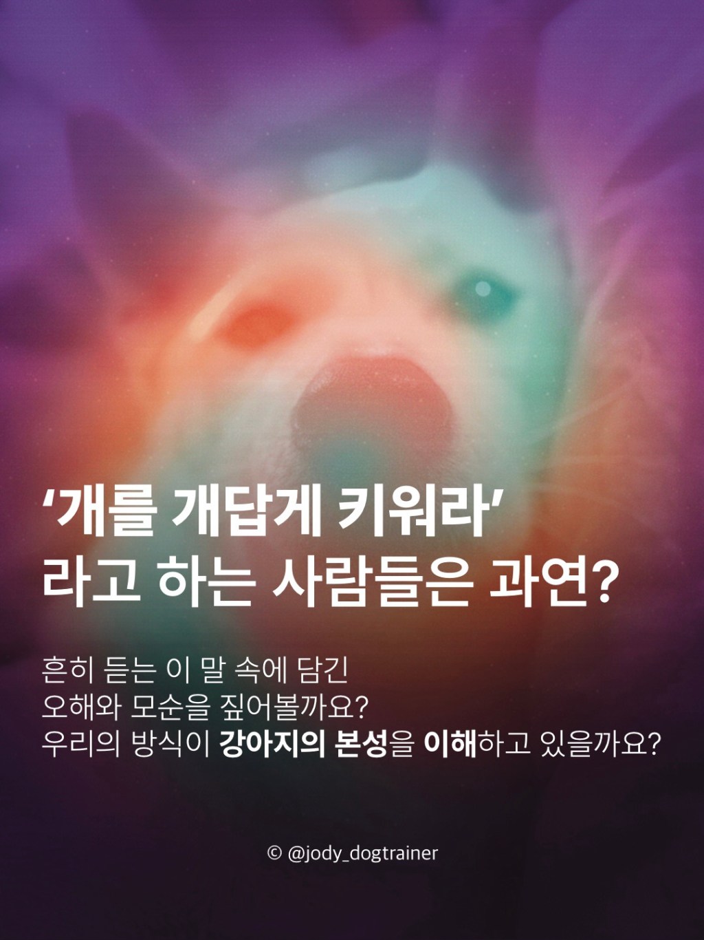 ”개는 개답게 키워야 한다“는 말에는 우리가 개의 본성을 제대로 이해하고 있는지에 대한 물음이 담겨 있습니다. 이 말의 가장 뿌리 깊은 오류는 개와 사람 간의 관계를 구시대적이고 비과학적인 ’늑대의 서열 이론‘에 빗대어 바라보는 잘못된 관점에서 출발한다는 것입니다. 이러한 관점은 강압적인 훈련을 정당화하며, 개를 ’무조건 복종시켜야 할 대상‘으로 여겨 개와 보호자 사이의 신뢰 기반을 송두리째 무너뜨립니다.