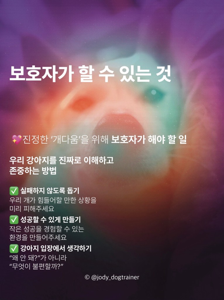 과학적 근거에 기반한 인도적인 훈련을 스스로 선택하고 실천함으로써, 반려견과의 관계에서 안전감과 신뢰를 최우선으로 해야 합니다.